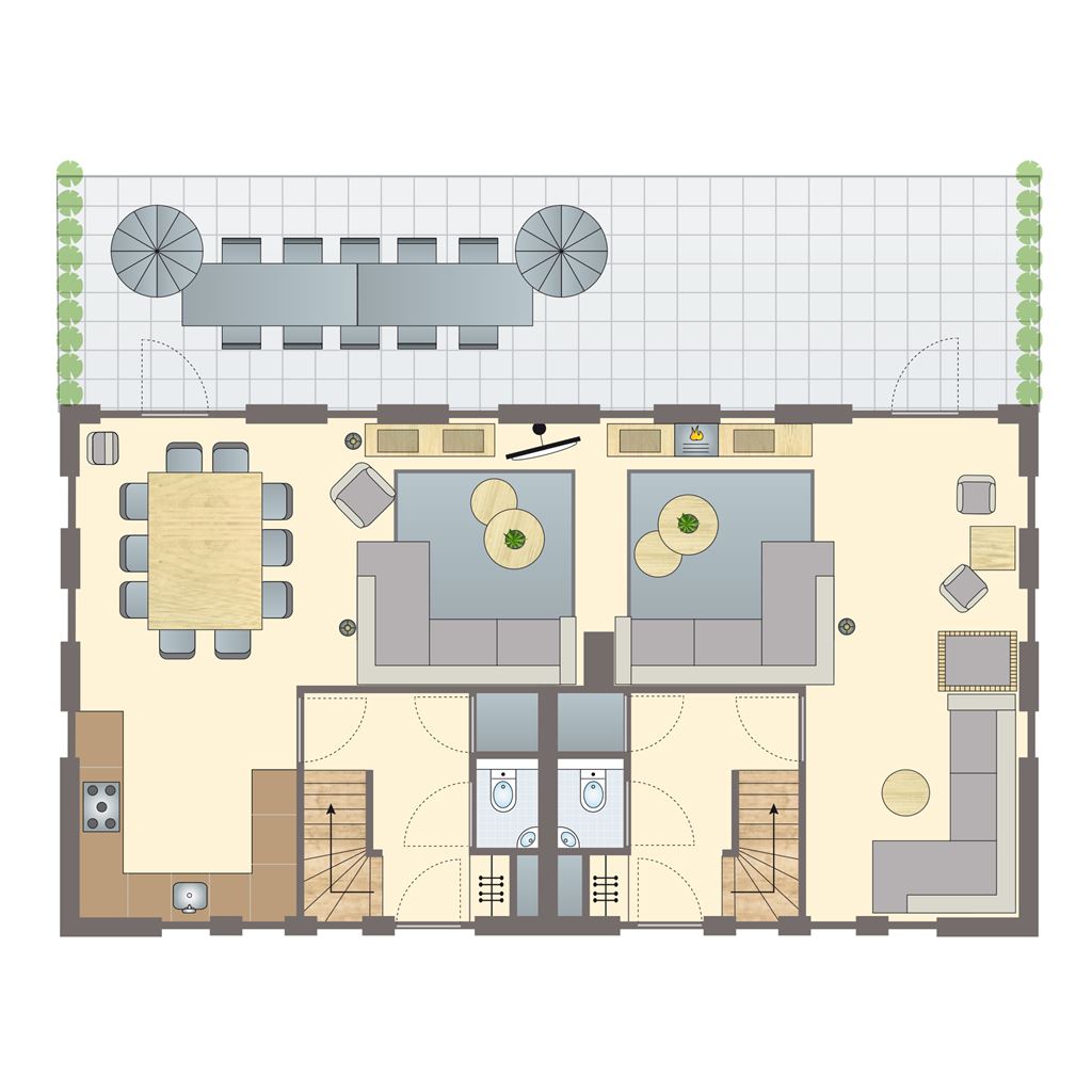 • Zwei Badezimmer mit jeweils Badewanne, ebenerdiger Dusche mit Regendusche und WC auf der ersten Etage