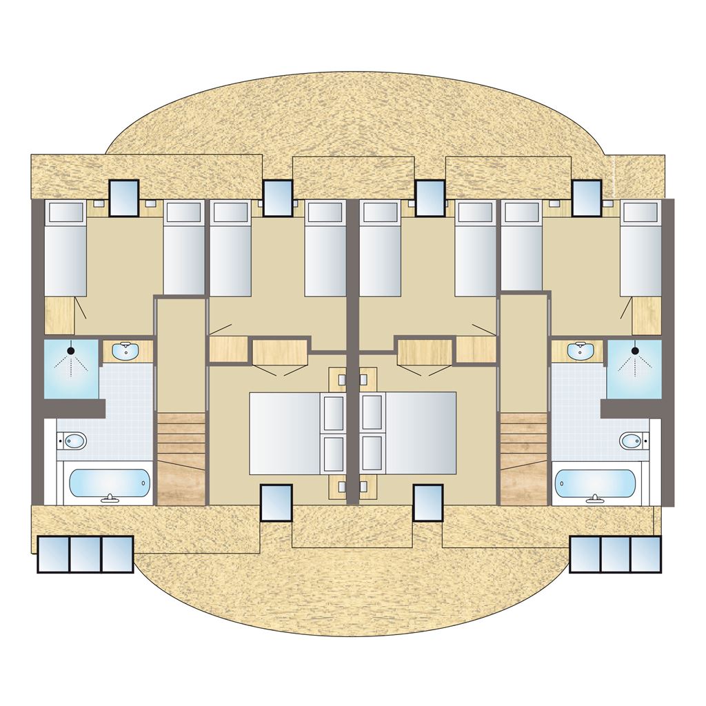 - Vier Schlafzimmer mit jeweils zwei Auping Boxspring-Einzelbetten auf der ersten Etage